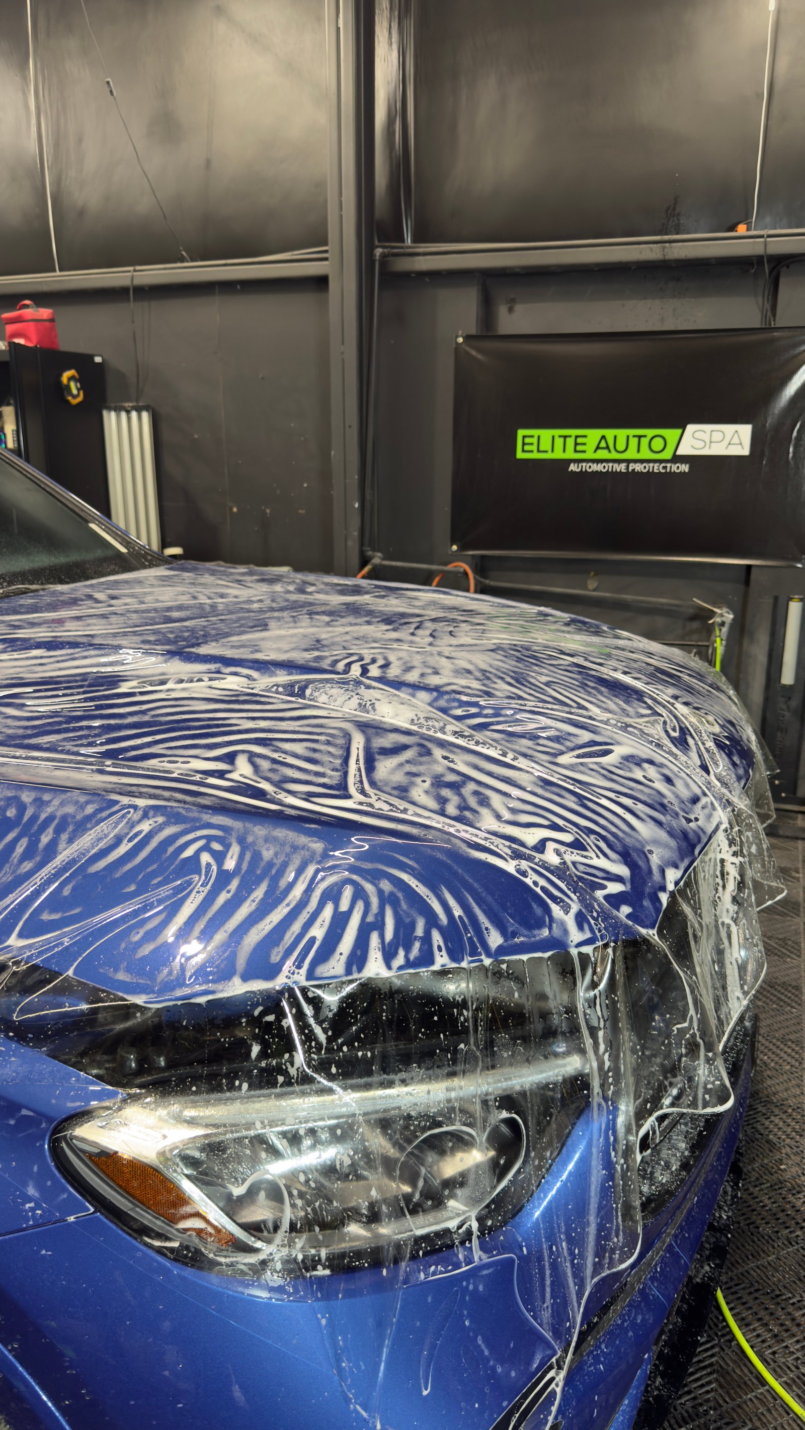 Caring for PPF is simple. We recommend waiting 7 days before the first wash. After that, you can wash the car as you normally would. Hand washing with a pH-neutral soap is best. You can use a pressure washer, but keep the nozzle at least 12-18 inches from the film's edges. The self-healing top coat means you won't need to worry about light swirl marks from washing.